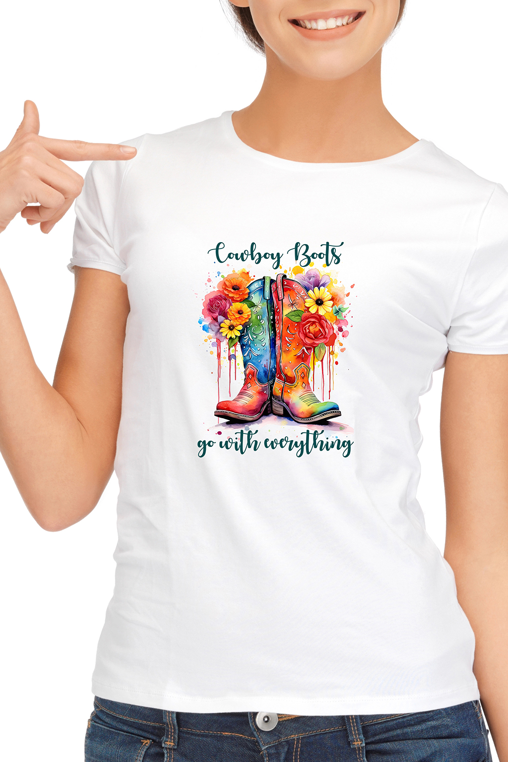 Laat je passie voor countrymuziek zien met dit unieke Cowboy Boots Go with everything shirt! Ontdek de ziel van het Wilde Westen met de collectie country-shirts van T-shirtfountain.nl. Laat je innerlijke cowboy of cowgirl naar voren komen met onze authentieke ontwerpen. Ze zijn geïnspireerd door de uitgestrekte vlaktes, evenals de ongerepte natuur en de rijke tradities van het Amerikaanse platteland. Laat je passie voor countrymuziek zien met onze unieke t-shirts, die niet alleen stijlvol zijn, maar ook een verhaal vertellen. Wij hebben voor elk wat wils. Of je nu op zoek bent naar een shirt voor een avondje dansen, een casual look voor overdag, of gewoon een eerbetoon aan je favoriete countryhelden. Dus trek je laarzen aan, zet je cowboyhoed op en omarm het gevoel van vrijheid en avontuur met onze country en western geïnspireerde t-shirt designs.